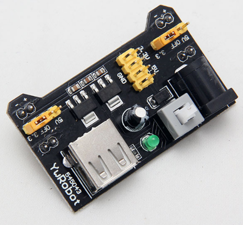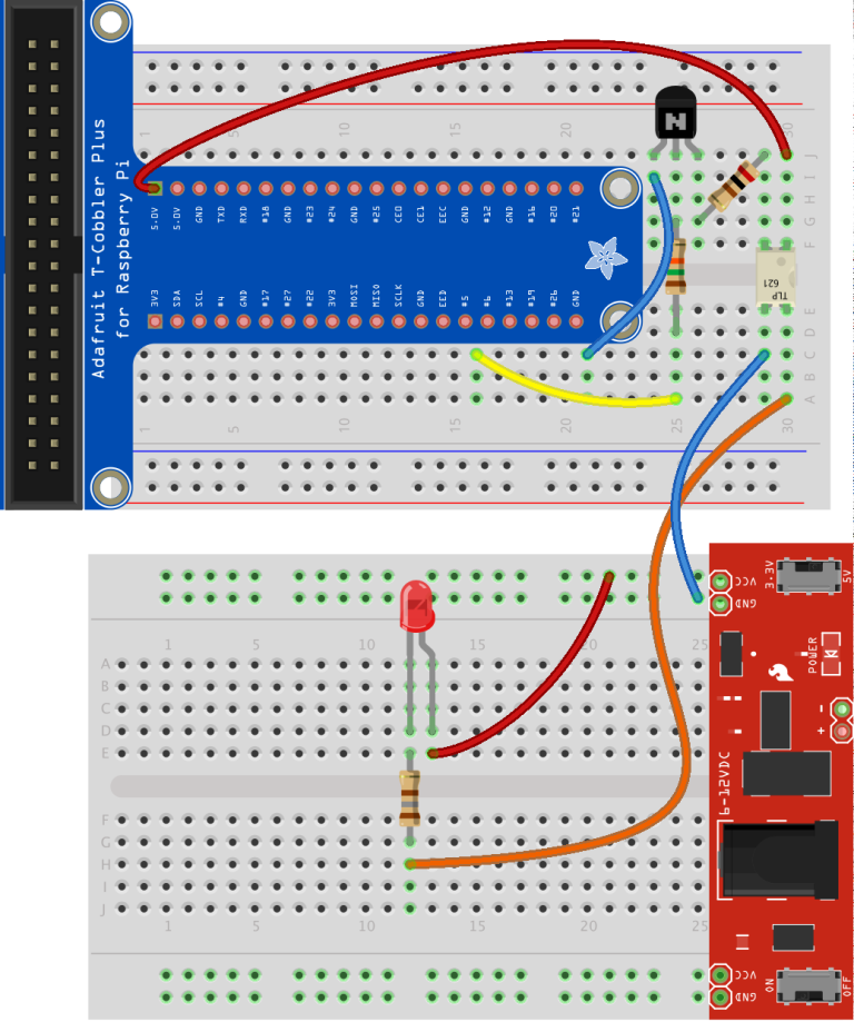 On the breadboard it would look something like like bellow, I put it on two boards so there would be no confusion in the guide with the side rails since some full size bread boards let the side rails go all the way while others half way. We don’t want to mix up the two power sources there.