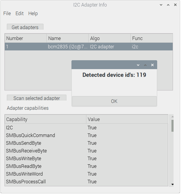 This should show our device at 0x77. Or if you use the example project that comes with the I2C plugin then you click Get adapters and then select the adapter and then click Scan the selected adapter this should get you 119, which converted to Hex is 0x77, same as the i2cdetect returns.