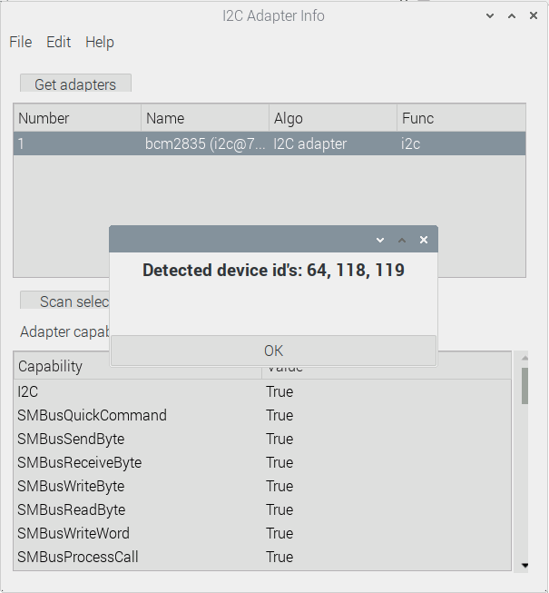 This should show our device at 0x40. Or if you use the example project that comes with the I2C plugin then you click Get adapters and then select the adapter and then click Scan the selected adapter this should get you 64, which converted to Hex is 0x40, same as the i2cdetect returns.