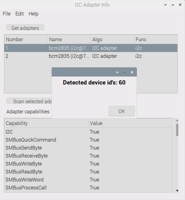 This should show our device at 0x3C most likely. Or if you use the example project that comes with the I2C plugin then you click Get adapters and then select the adapter and then click Scan the selected adapter this should get you 60, which converted to Hex is 0x3C, same as the i2cdetect returns.